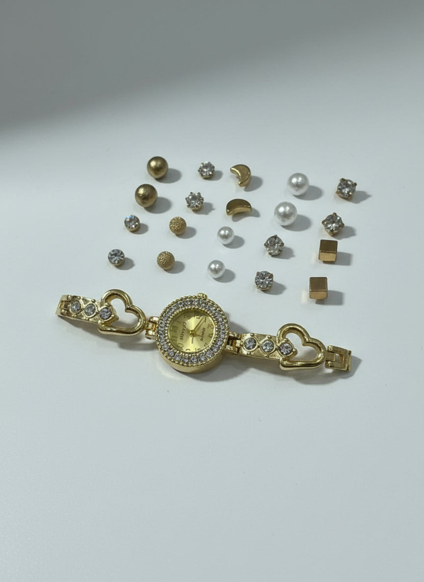 The analog watch features a sleek dial with easy-to-read hour markers, paired with a comfortable strap for all-day wear. The matching earrings beautifully complement the watch, creating a coordinated and stylish look. This set comes in a gift-ready package, making it an ideal present for birthdays, anniversaries, weddings, or festive occasions.